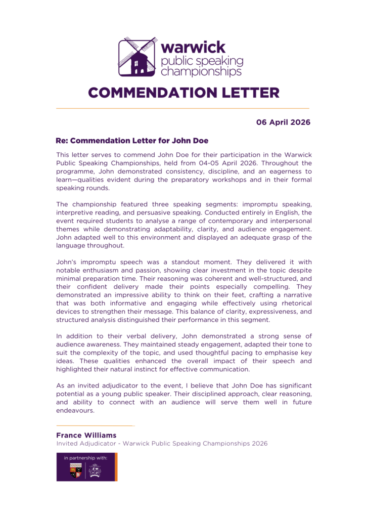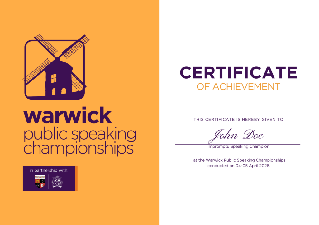 The University of Warwick has long been a hub for intellectual growth, nurturing generations of confident speakers, critical thinkers, and leaders. Home to one of the United Kingdom’s most respected public speaking and debate communities, Warwick continues to inspire excellence in communication on the global stage. The Warwick Public Speaking Championships carry forward this tradition—providing young voices with the opportunity to develop their skills, express their ideas with impact, and be part of a legacy that celebrates the power of effective communication.